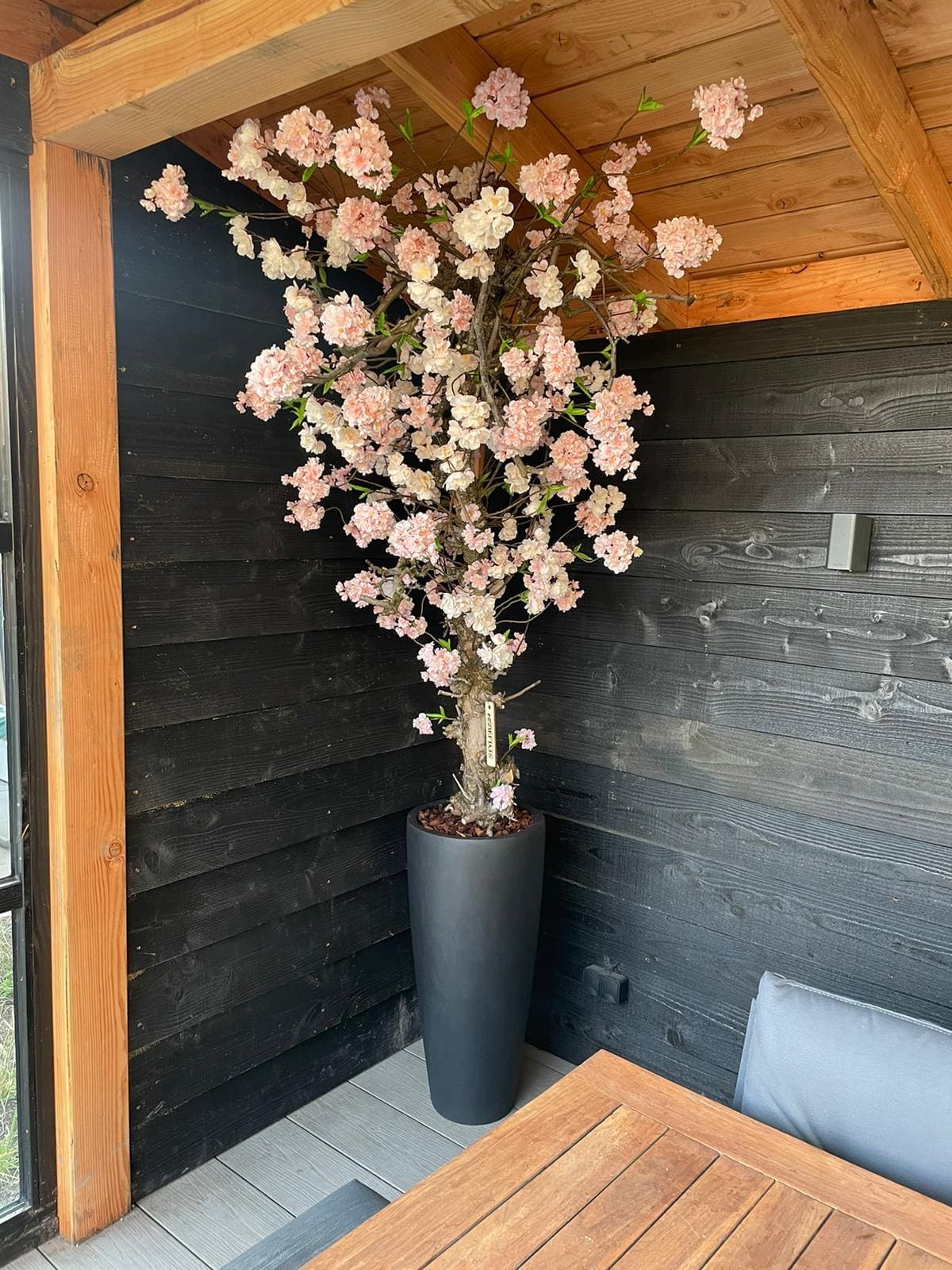 Creëer een serene sfeer waar stijl en gemak samenkomen. Deze roze bloesemboom is de perfecte keuze om jouw veranda te verrijken! 🌸🖤