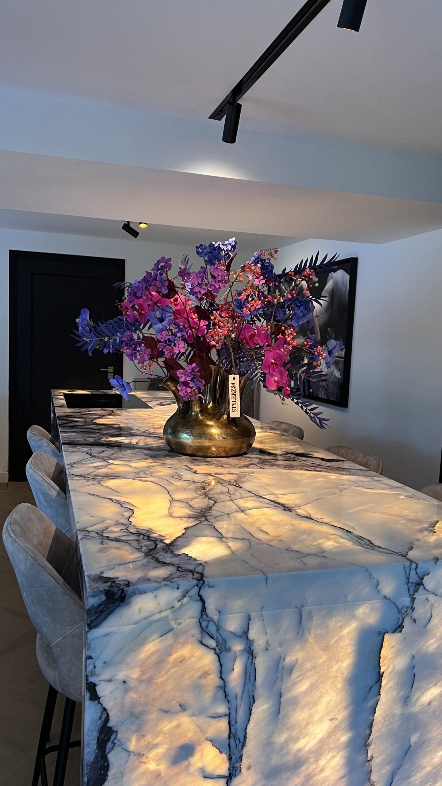 Breng luxe, kleur en verfijning in uw interieur met dit unieke bloemstuk, dat jarenlang zijn schoonheid behoudt.