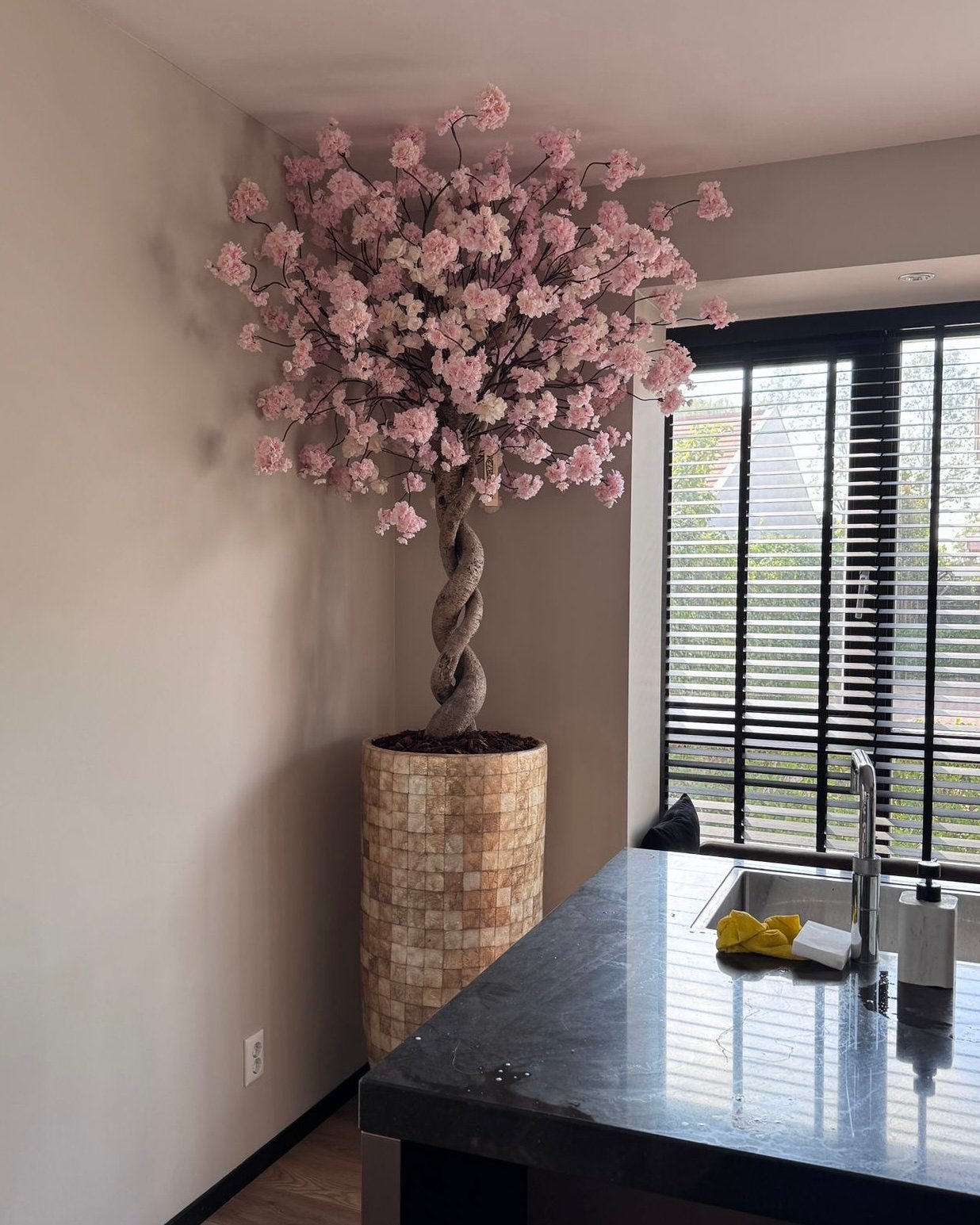 Deze unieke boom is opgebouwd uit een gedraaide stam van echt hout, gecombineerd met hoogwaardige zijden bloesemtakken in zachte roze en champagne tinten. Het resultaat is een stijlvolle eyecatcher die in elke ruimte sfeer brengt.